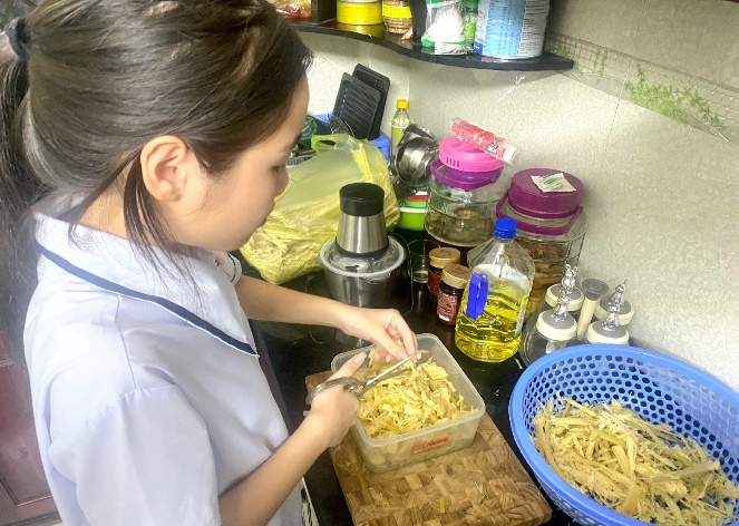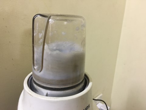 • Bã mía sau khi được ngâm rửa sạch và đun sôi được chúng em cắt, chặt nhỏ rồi cho vào máy xay sinh tố đổ sắp nước và xay cho đến khi nhuyễn thành bột.