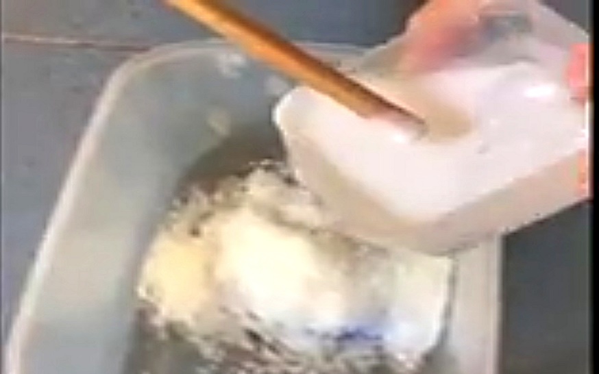 • Hỗn hợp nước bã mía đã được lọc cho thêm nước oxi già theo tỉ lệ 5:1 vào ngâm thêm 2 tiếng để loại bỏ màu bã mía, tạo độ trắng cho giấy đồng thời tránh ẩm mốc sau này.