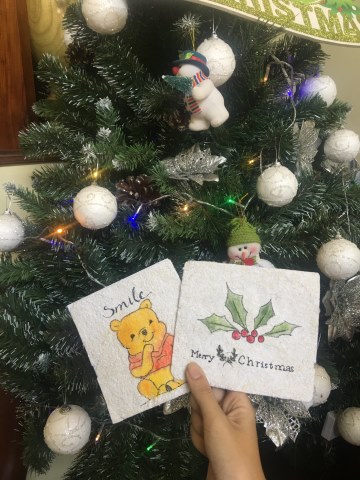 Sau khi đã tạo thành giấy bã mía chúng em tiến hành tạo ra các sản phẩm thủ công từ mẫu giấy mình làm được như những bức tranh, lịch cầm tay, các tấm thiệp, bookmark hay các loại Card visit…Hạt giống lúc này được chúng em gắn lên sản phẩm bằng 1 lớp hồ gạo thật mỏng để trang trí, và nếu không sử dụng giấy sẽ được tái sinh thành những mầm non mang màu xanh Cát Bà đi đến muôn nơi.
