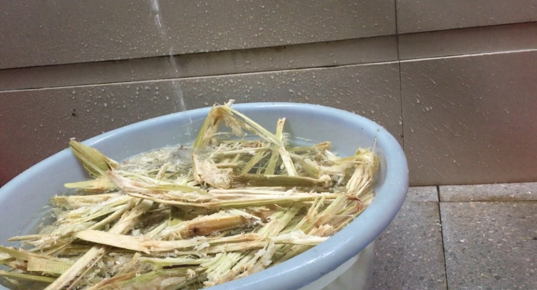 Bã mía sau khi được thu gom sẽ được chúng em rửa sạch, và ngâm bã mía trong nước sạch khoảng 3 tiếng để loại bỏ mùi và thu được bã mía sạch, cho vào đun sôi khoảng 20-30 phút để loại bỏ hết lượng đường còn sót lại trong bã mía.