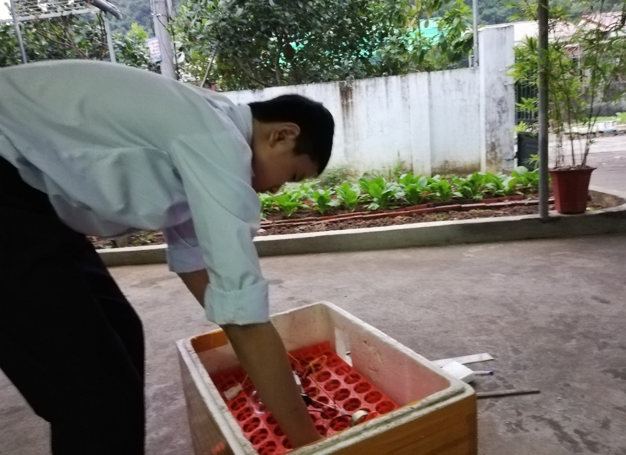 Qua nghiên cứu, tìm tòi, học hỏi, lắp đặt thành công, chúng em tiến hành thử nghiệm thì thấy trứng xếp vào hai khay được 100 quả, nhiệt độ ổn định, quạt gió chạy đều, giá trứng được đảo đều, trứng nóng đều.Chúng em đang tiến hành ấp trứng và được 10 ngày và khoảng 10 ngày nữa thị trứng sẽ nở thành gà con.