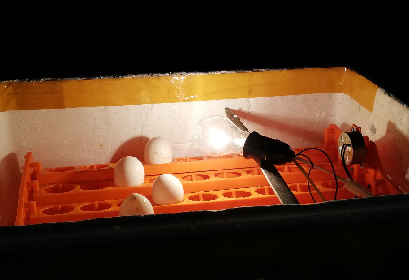 - Đóng điện bóng đèn sợi đốt sáng sinh nhiệt (thay cho gà mái ấp trứng), Đặt chế độ rơ le cảm biến nhiệt ở 370C, chênh lệch nhiệt độ là 0,5 độ. Khi cấp nhiệt cho thùng ấp bằng  bóng đèn sợi đốt nhiệt độ trong thùng ấp tăng dần, đến khi nhiệt độ thùng ấp đủ 370C rơ le cảm ứng nhiệt tự động ngắt điện, đèn tự tắt, nhiệt độ trong thùng giảm dần xuống đến 36,50C rơ le đóng lại đèn sáng lại tiếp tục cung cấp nhiệt,và cứ liên tục tuần hoàn như đến khi đủ 21 ngày thì trứng nở thành gà con.