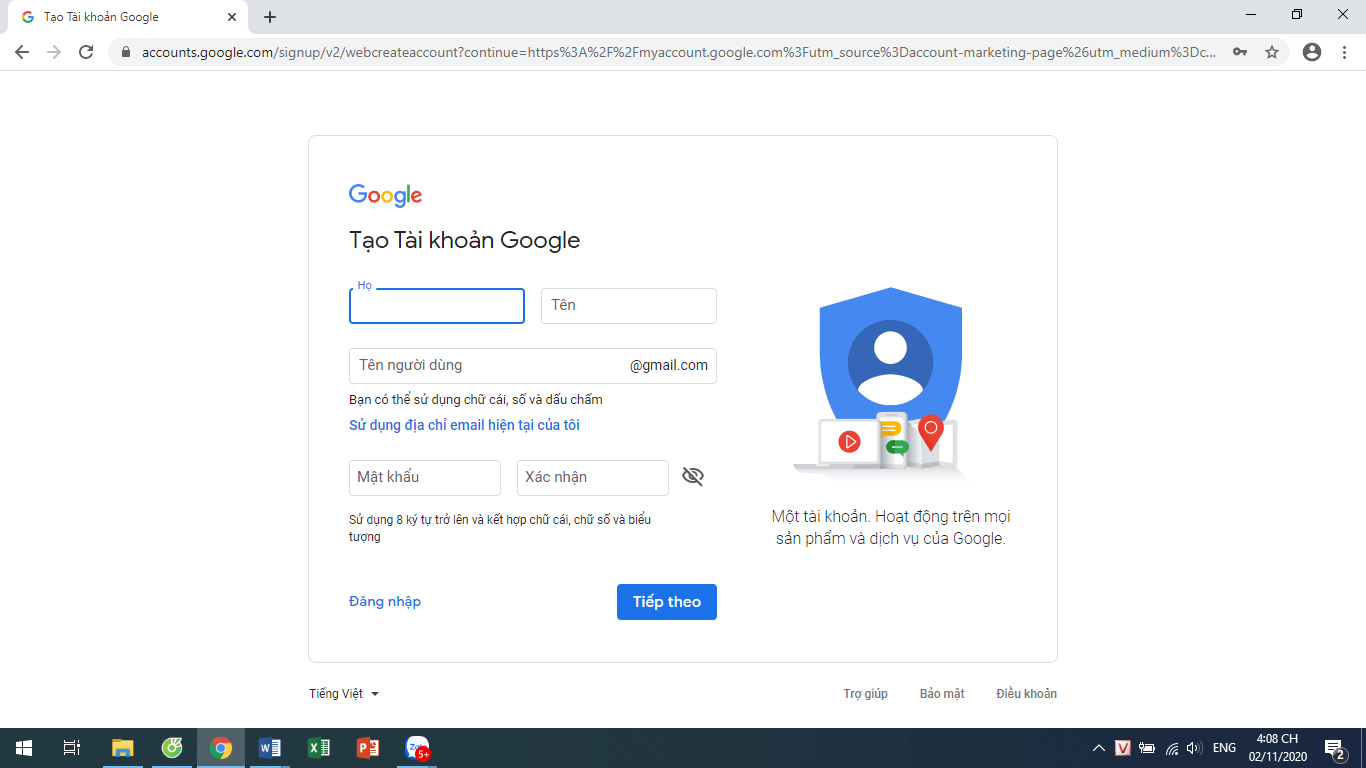 - Bước 1: Tạo tài khoản gmail: truy cập link Đăng ký Gmail; hoàn thiện thông tin theo yêu cầu hướng dẫn.